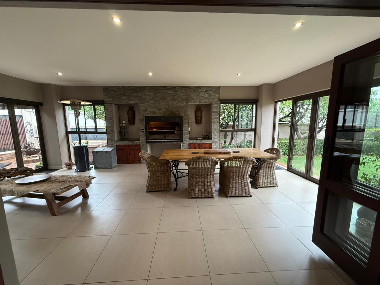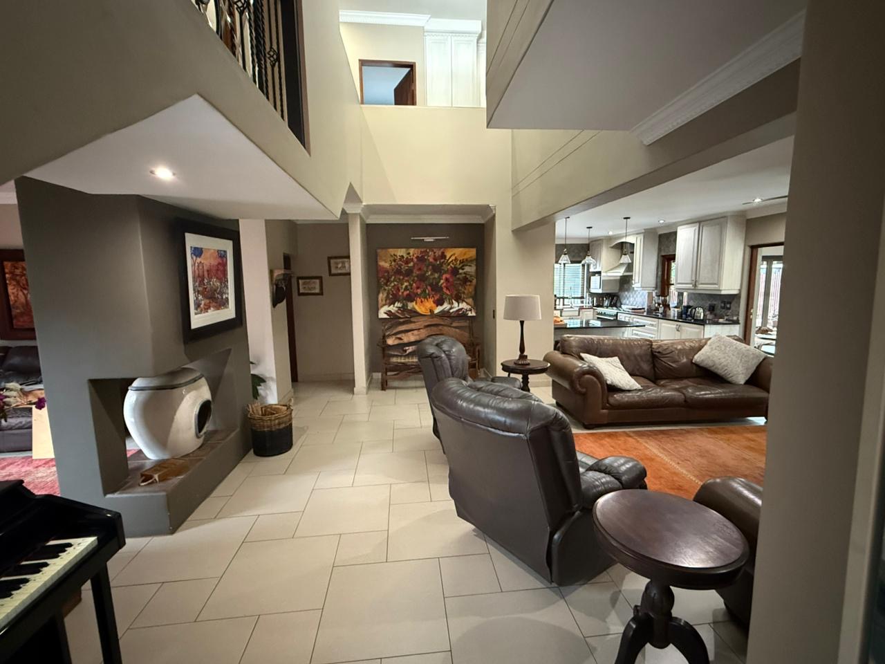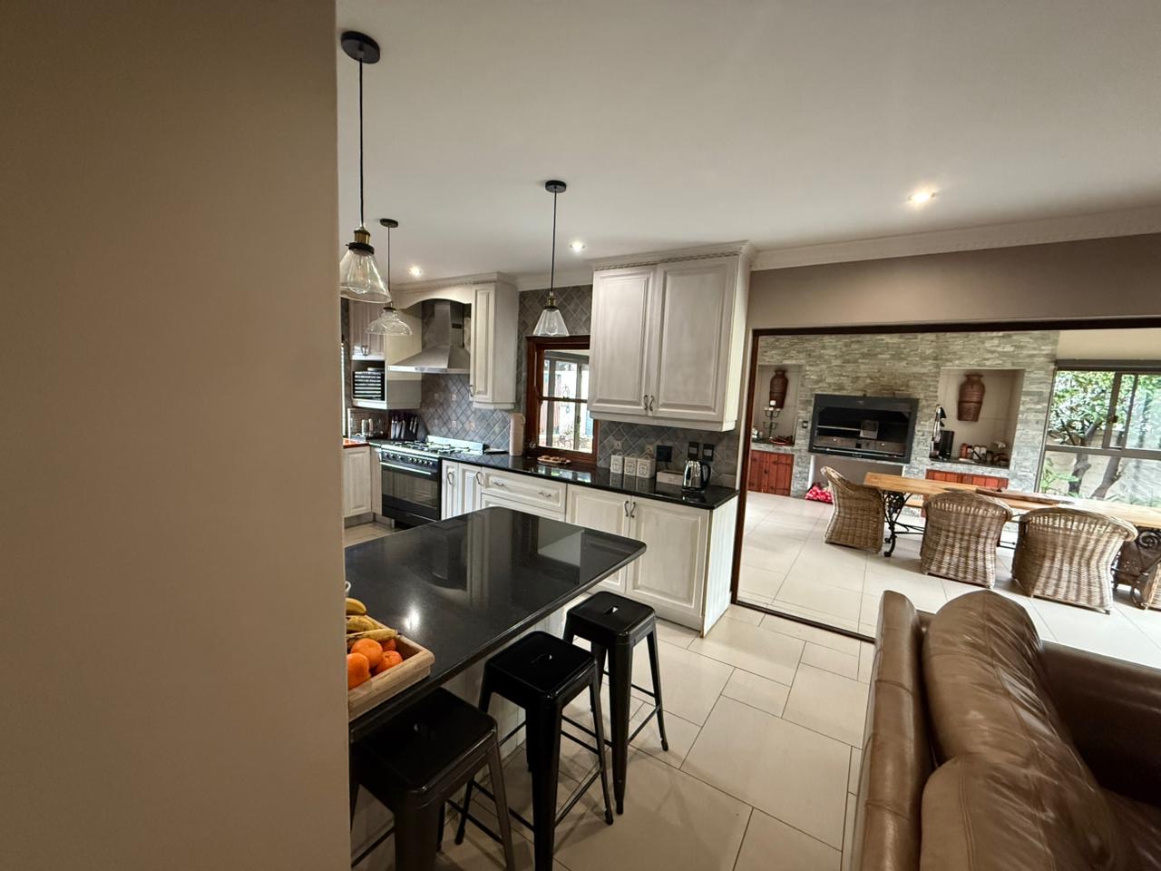 The home's design seamlessly blends classic charm with contemporary comfort. The heart of this home is its open-plan kitchen, featuring stylish white shaker-style cabinets, dark countertops, a central island with seating, and modern stainless steel appliances, including a gas range. A tiled backsplash and pendant lighting enhance its appeal. This culinary space flows effortlessly into the dining area and a dedicated braai room, perfect for entertaining. Large sliding doors connect the interior to the garden, offering scenic views and an ideal setting for outdoor gatherings. Accommodation comprises five generously sized bedrooms and three well-appointed bathrooms, 3 of which are en-suites, providing ultimate privacy and convenience.