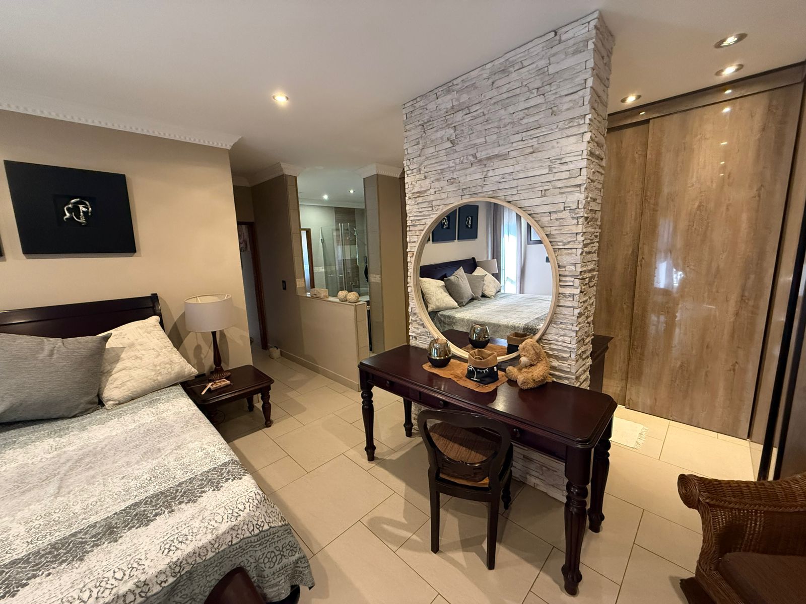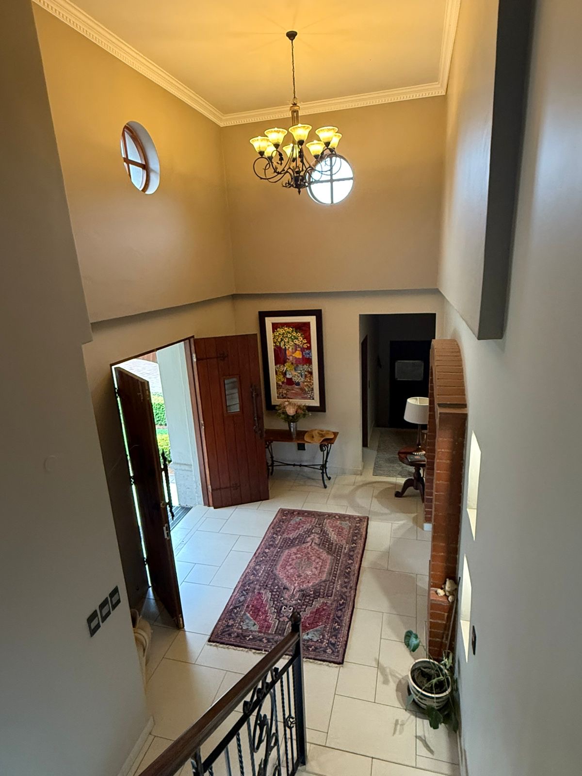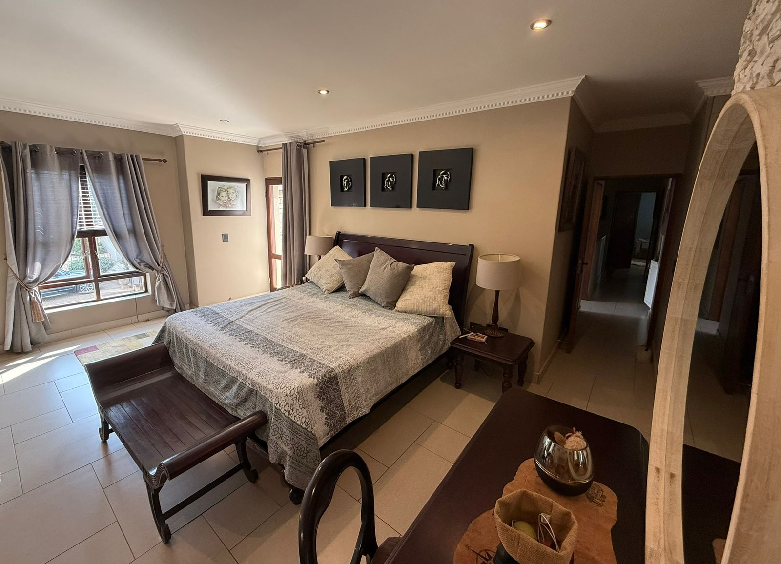 The home's design seamlessly blends classic charm with contemporary comfort. The heart of this home is its open-plan kitchen, featuring stylish white shaker-style cabinets, dark countertops, a central island with seating, and modern stainless steel appliances, including a gas range. A tiled backsplash and pendant lighting enhance its appeal. This culinary space flows effortlessly into the dining area and a dedicated braai room, perfect for entertaining. Large sliding doors connect the interior to the garden, offering scenic views and an ideal setting for outdoor gatherings. Accommodation comprises five generously sized bedrooms and three well-appointed bathrooms, 3 of which are en-suites, providing ultimate privacy and convenience.