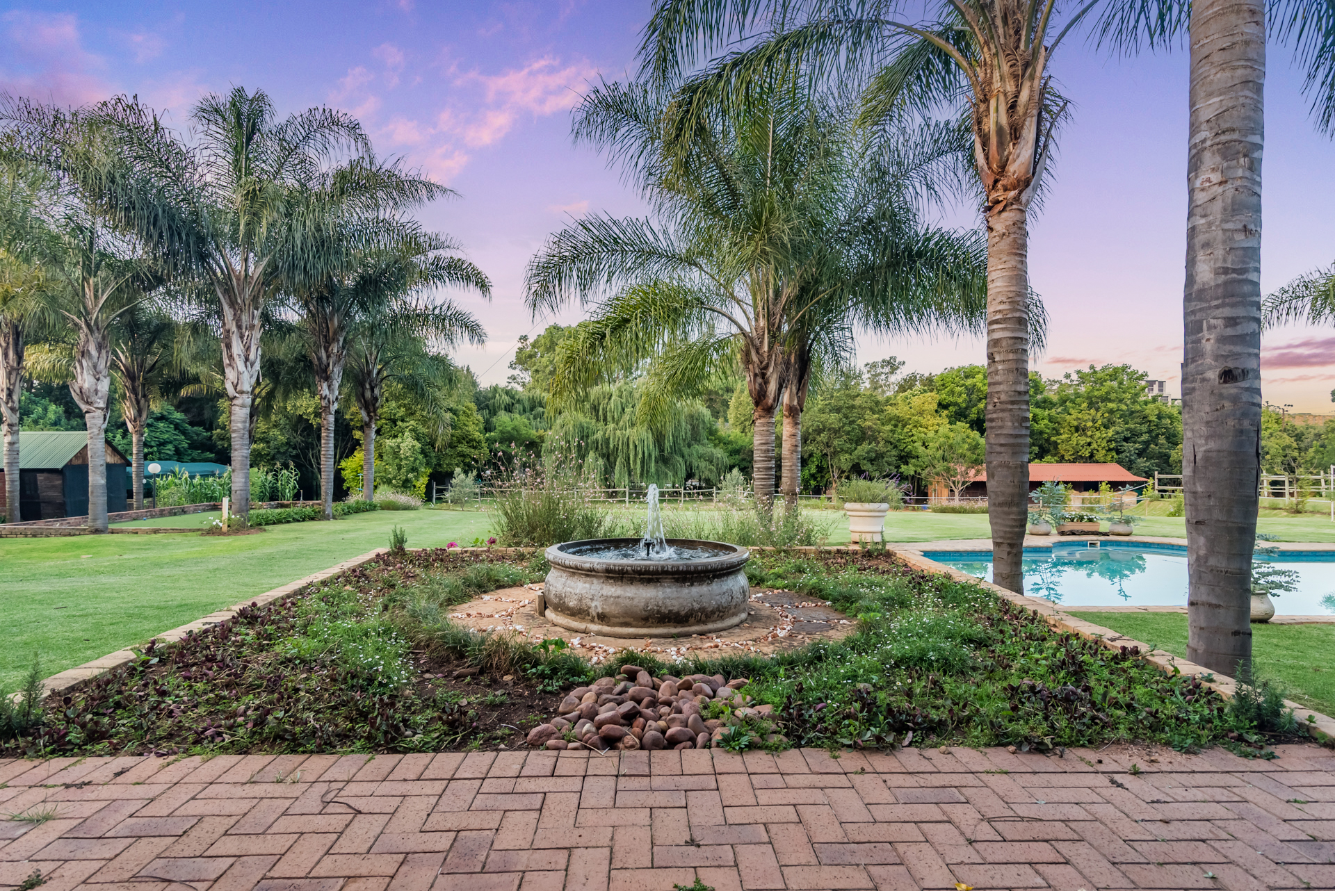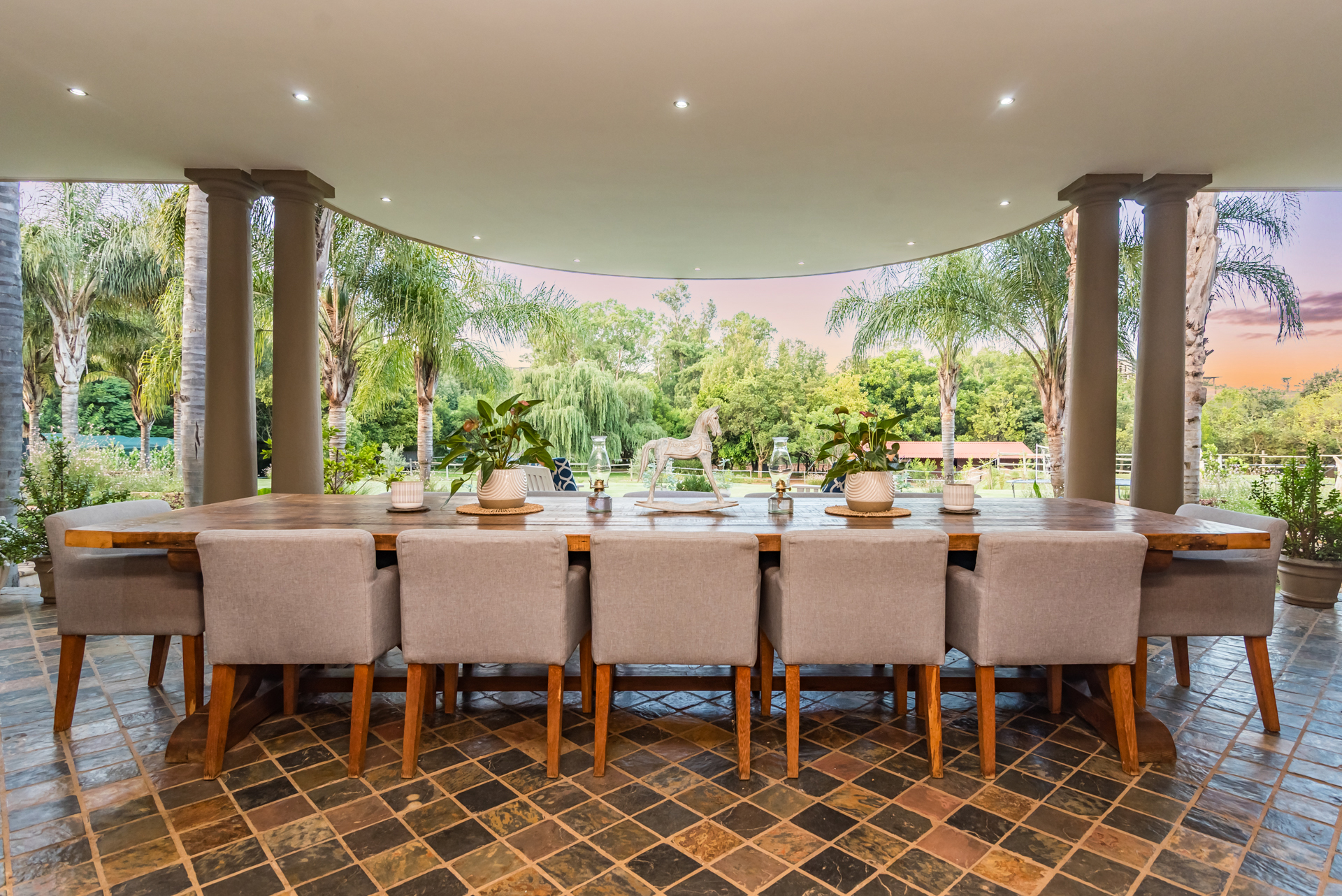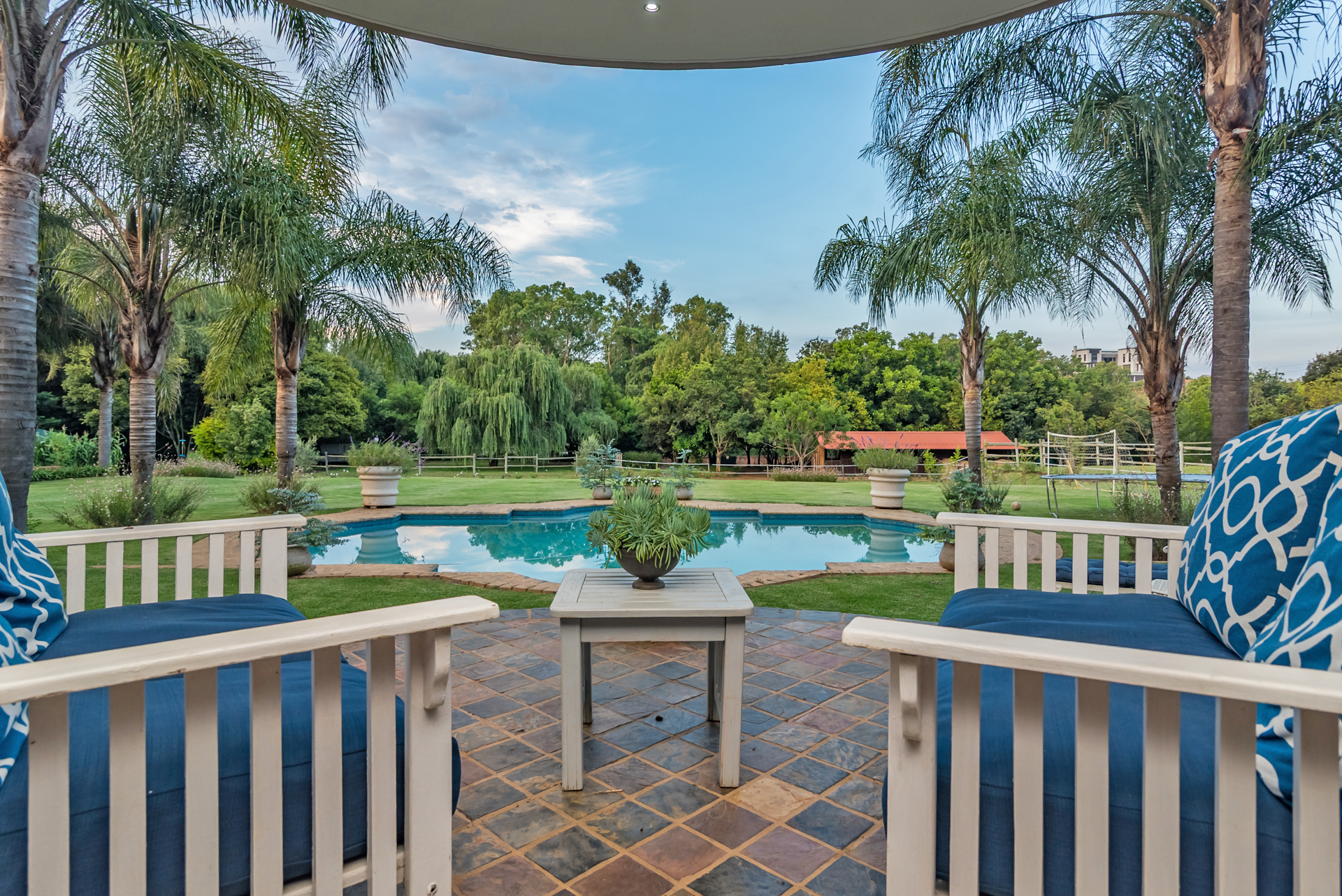 The beautiful country-style kitchen overlooks the picturesque garden and stables beyond allowing you to enjoy peaceful views of your horses from the heart of your home. A large entertainment patio with built-in braai flows to the sparkling pool and offers sweeping views over the Mooikloof sunrises.