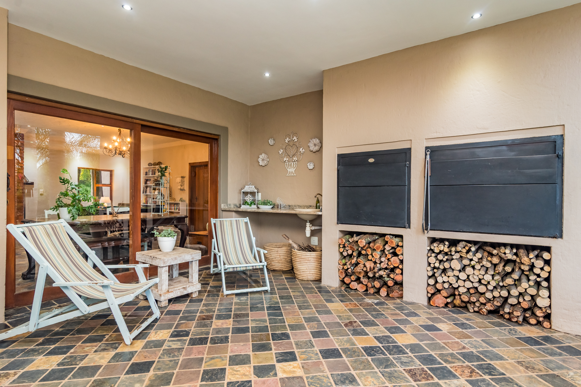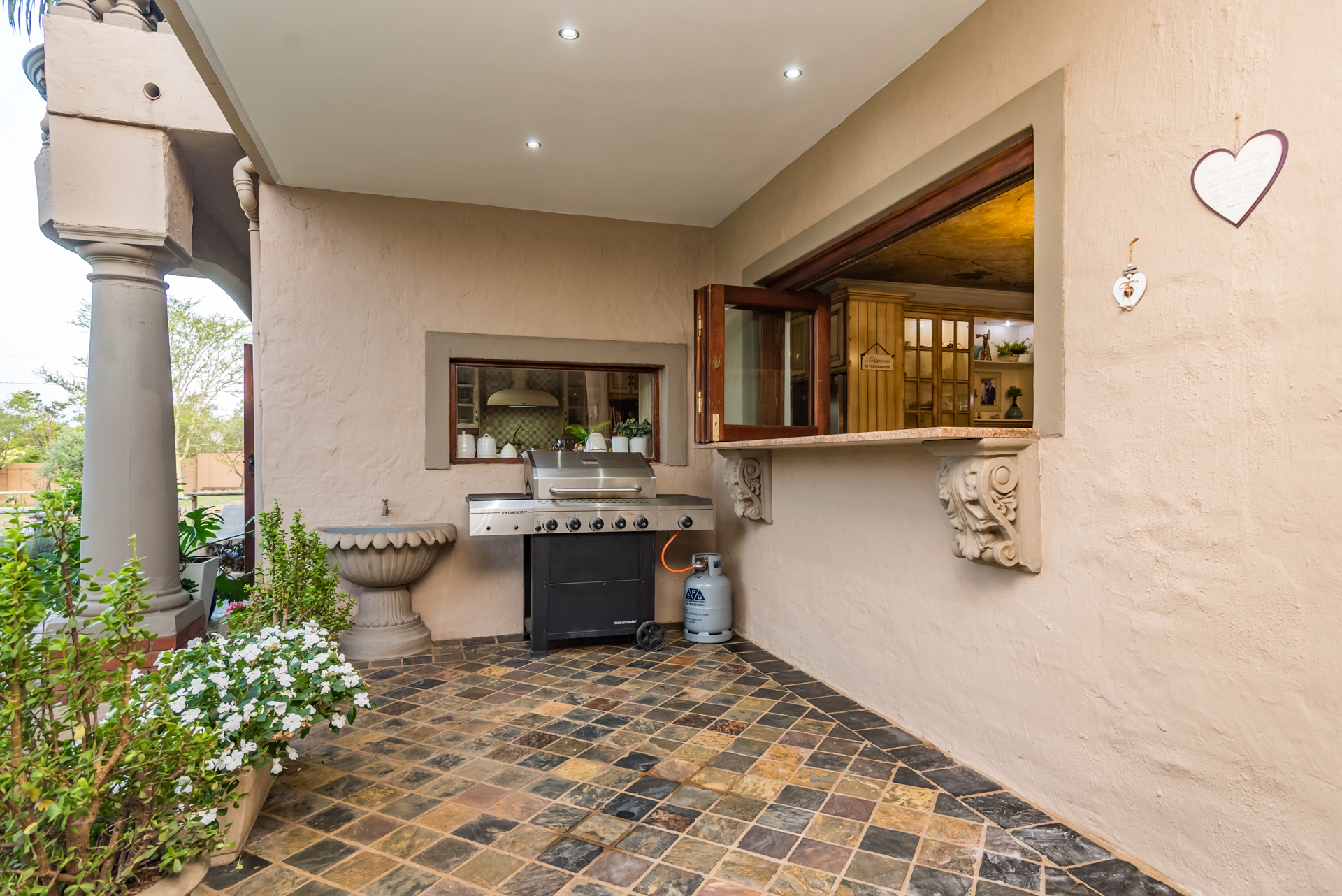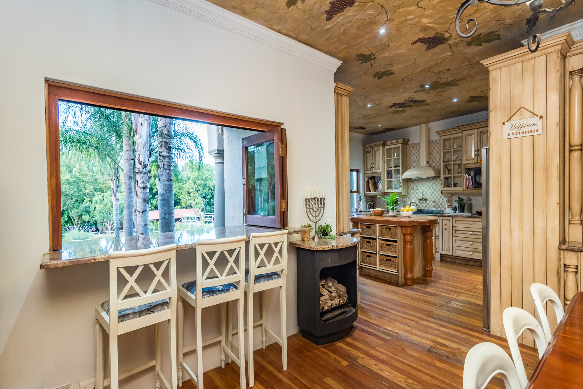 The beautiful country-style kitchen overlooks the picturesque garden and stables beyond allowing you to enjoy peaceful views of your horses from the heart of your home. A large entertainment patio with built-in braai flows to the sparkling pool and offers sweeping views over the Mooikloof sunrises.