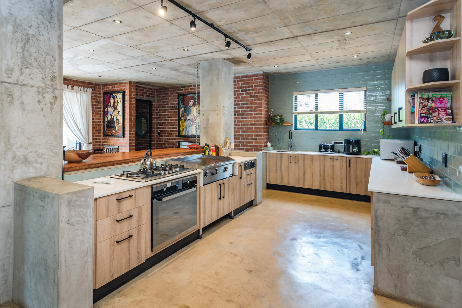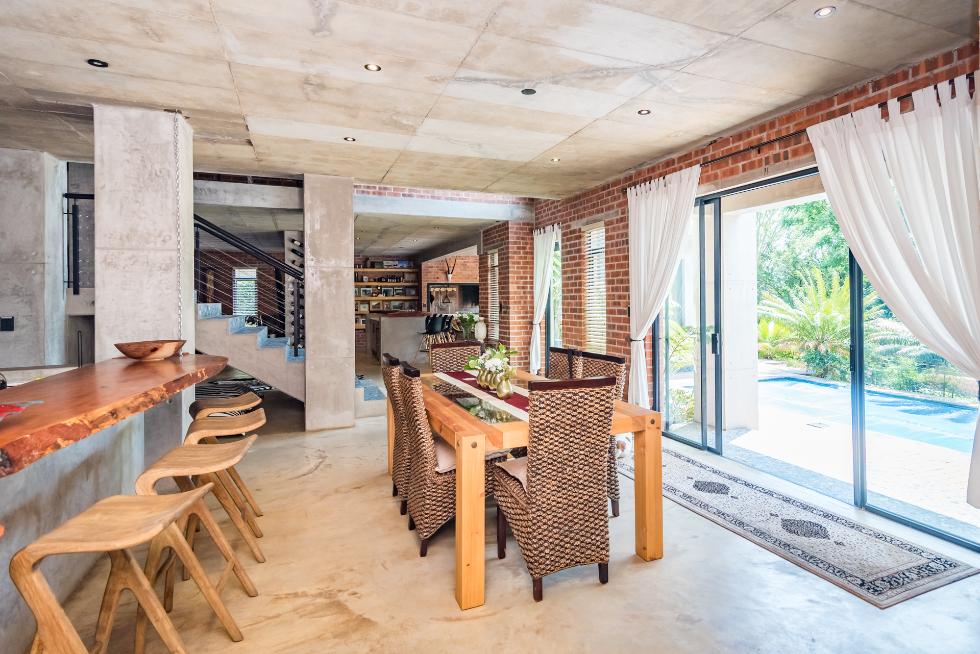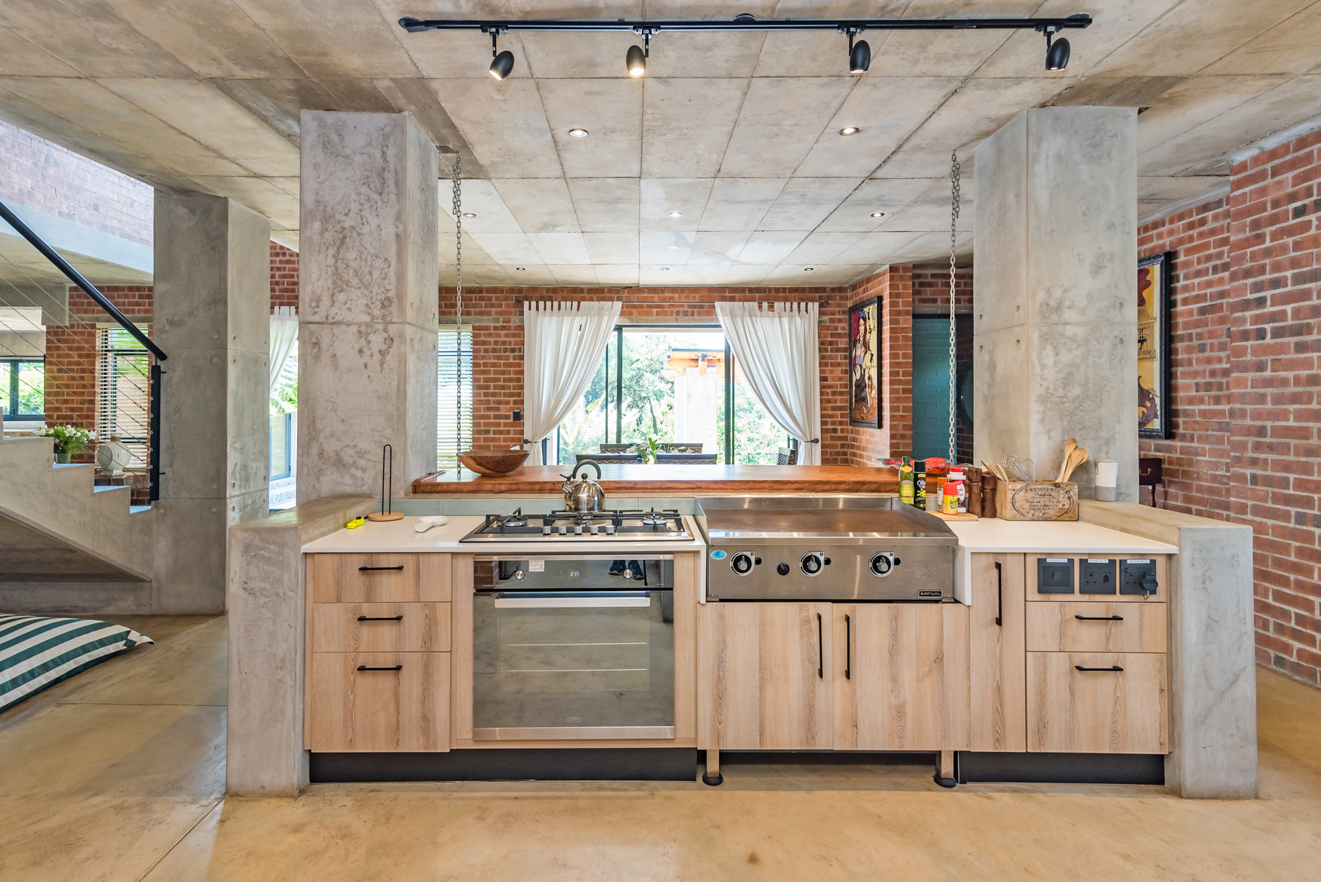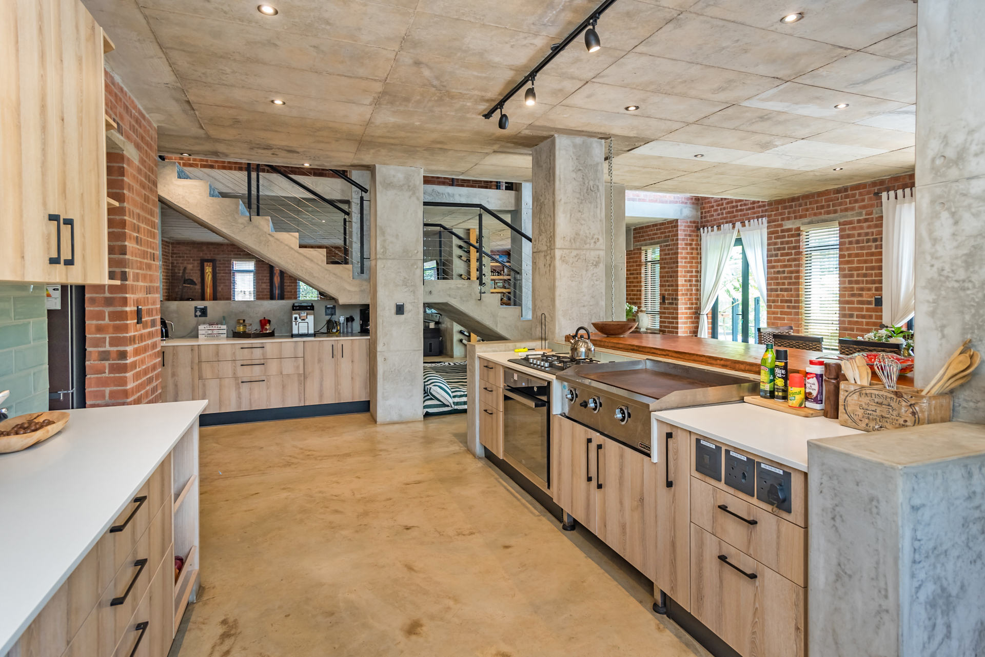 Expansive open-plan living and dining areas flow seamlessly beneath soaring ceilings, enhanced by oversized windows that flood the interiors with natural light. Carefully curated industrial elements - exposed textures, steel accents, and statement lighting - blend harmoniously with sleek modern finishes to create a warm yet striking atmosphere.