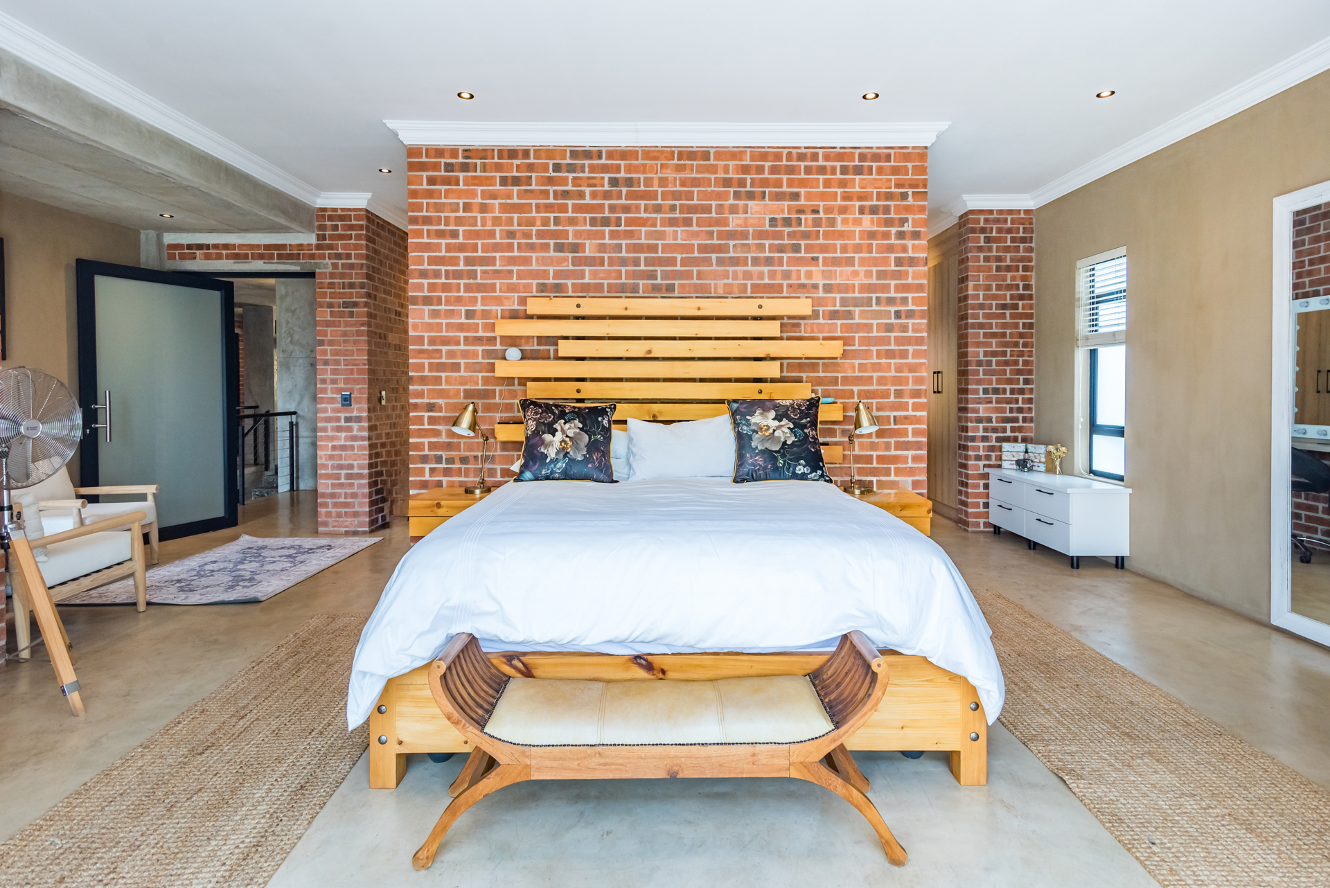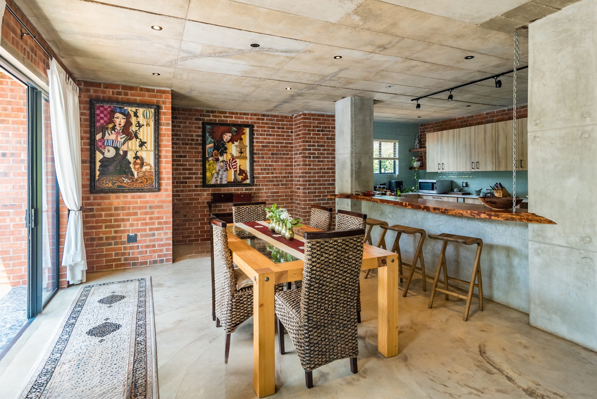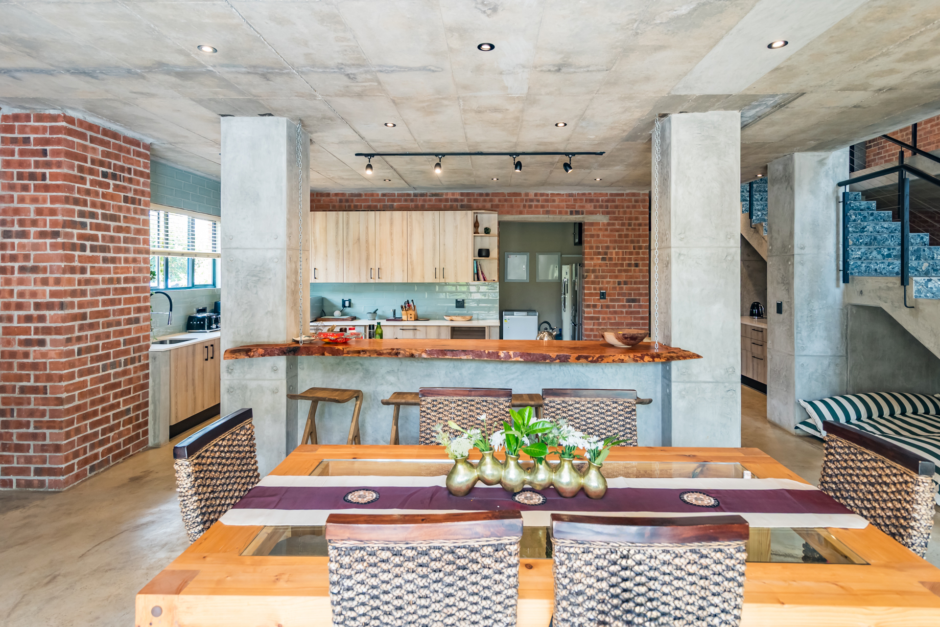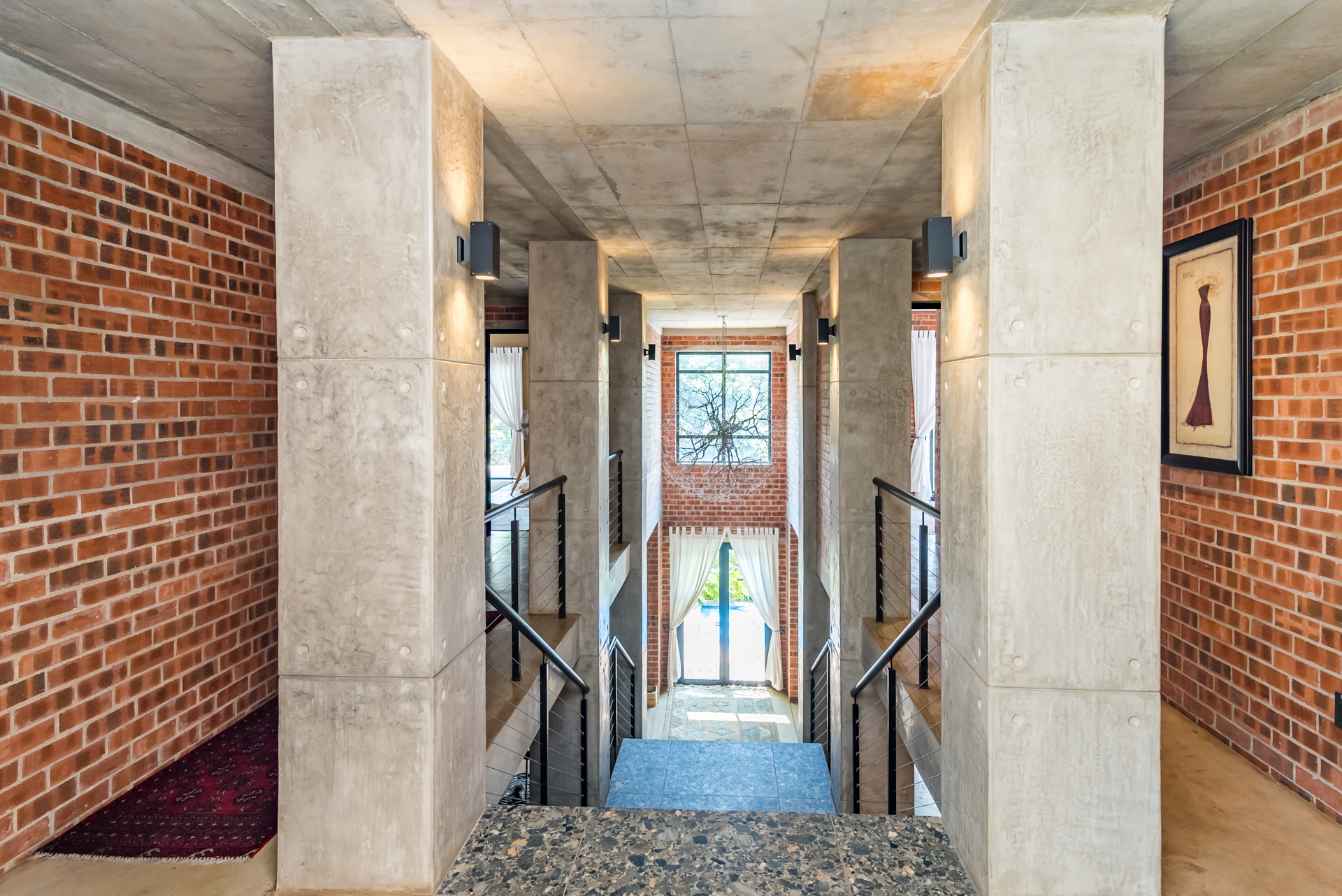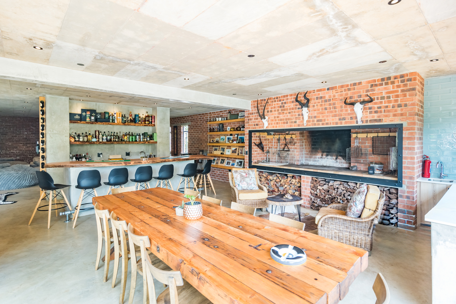 Expansive open-plan living and dining areas flow seamlessly beneath soaring ceilings, enhanced by oversized windows that flood the interiors with natural light. Carefully curated industrial elements - exposed textures, steel accents, and statement lighting - blend harmoniously with sleek modern finishes to create a warm yet striking atmosphere.