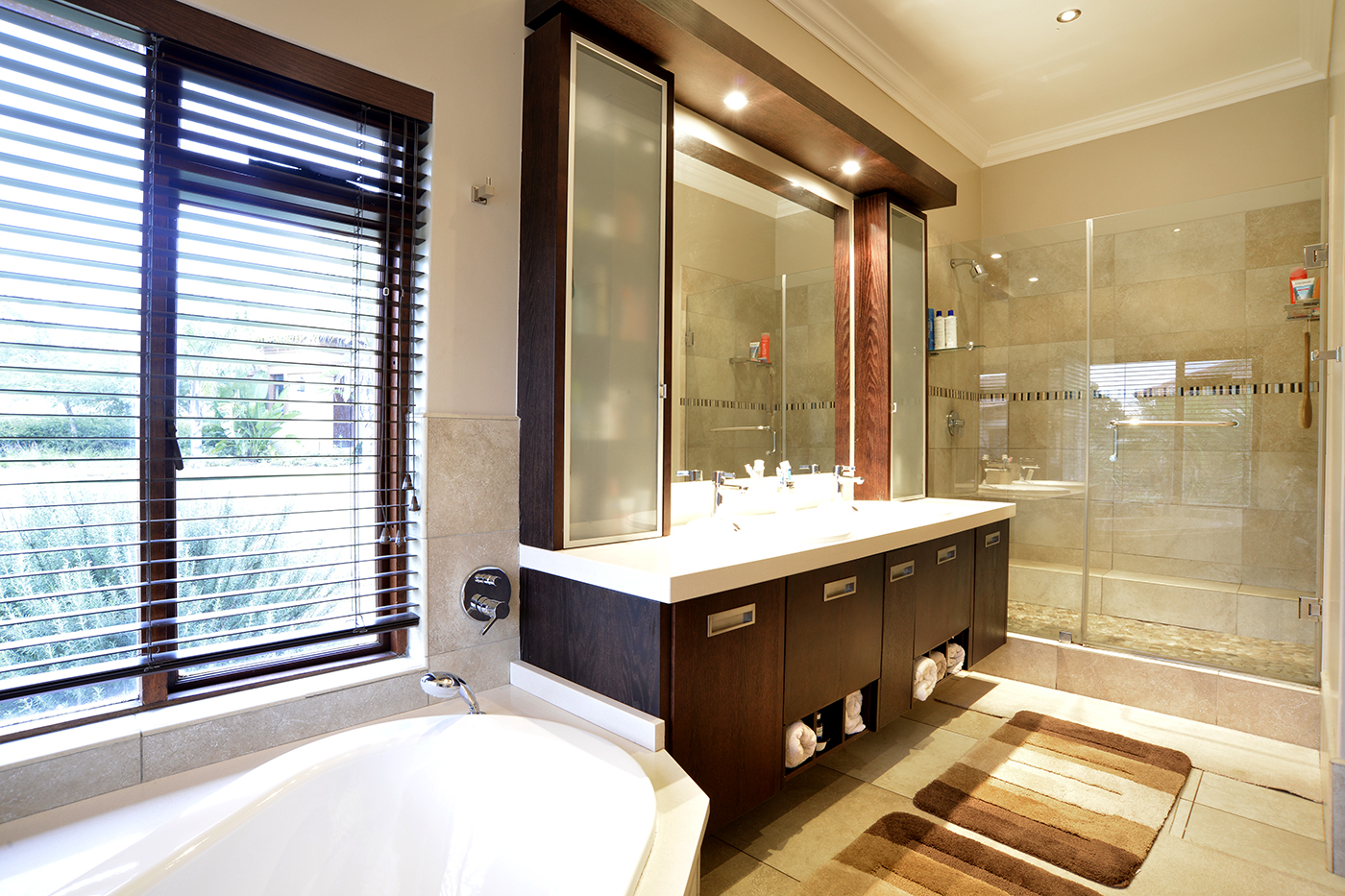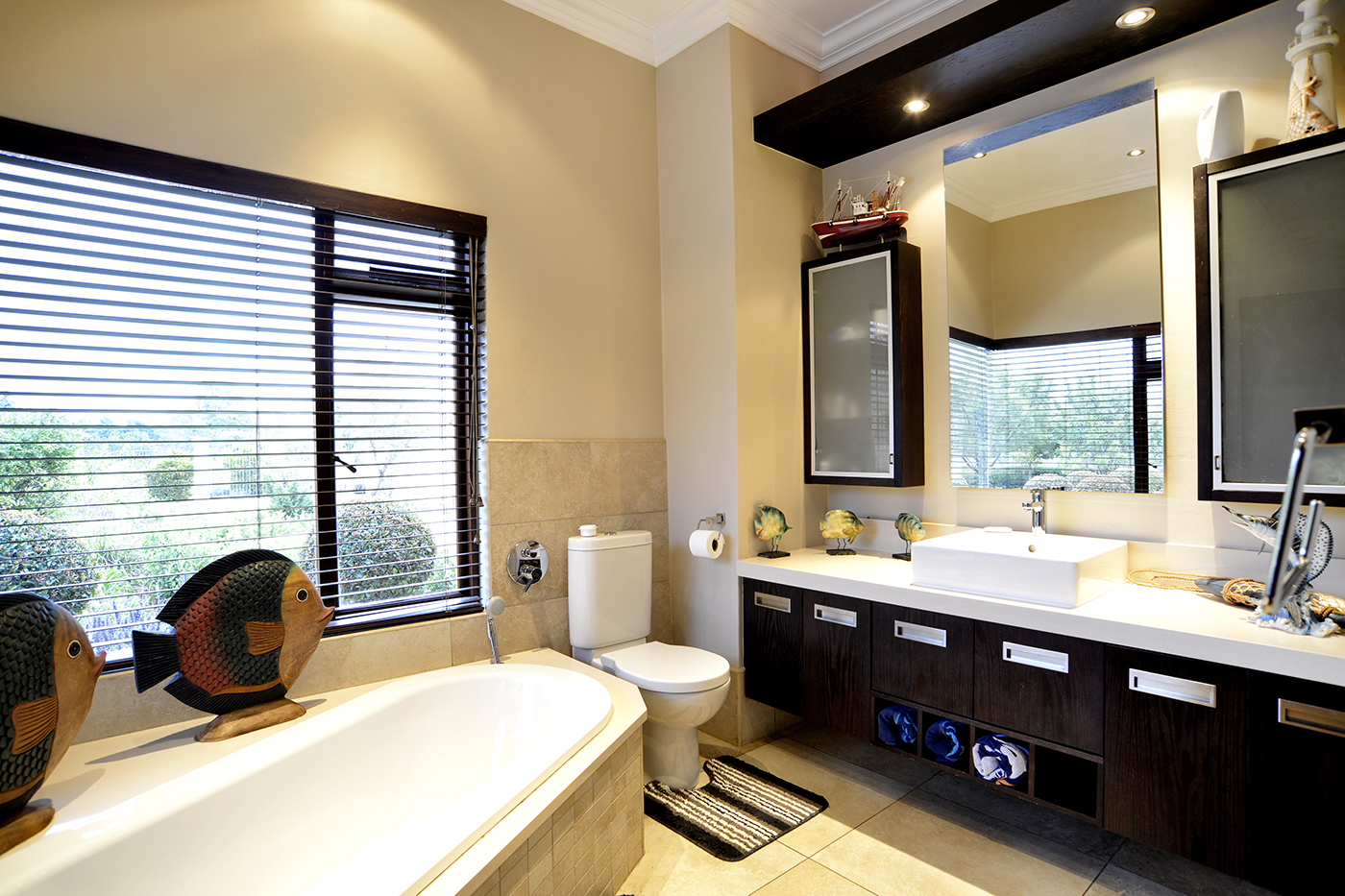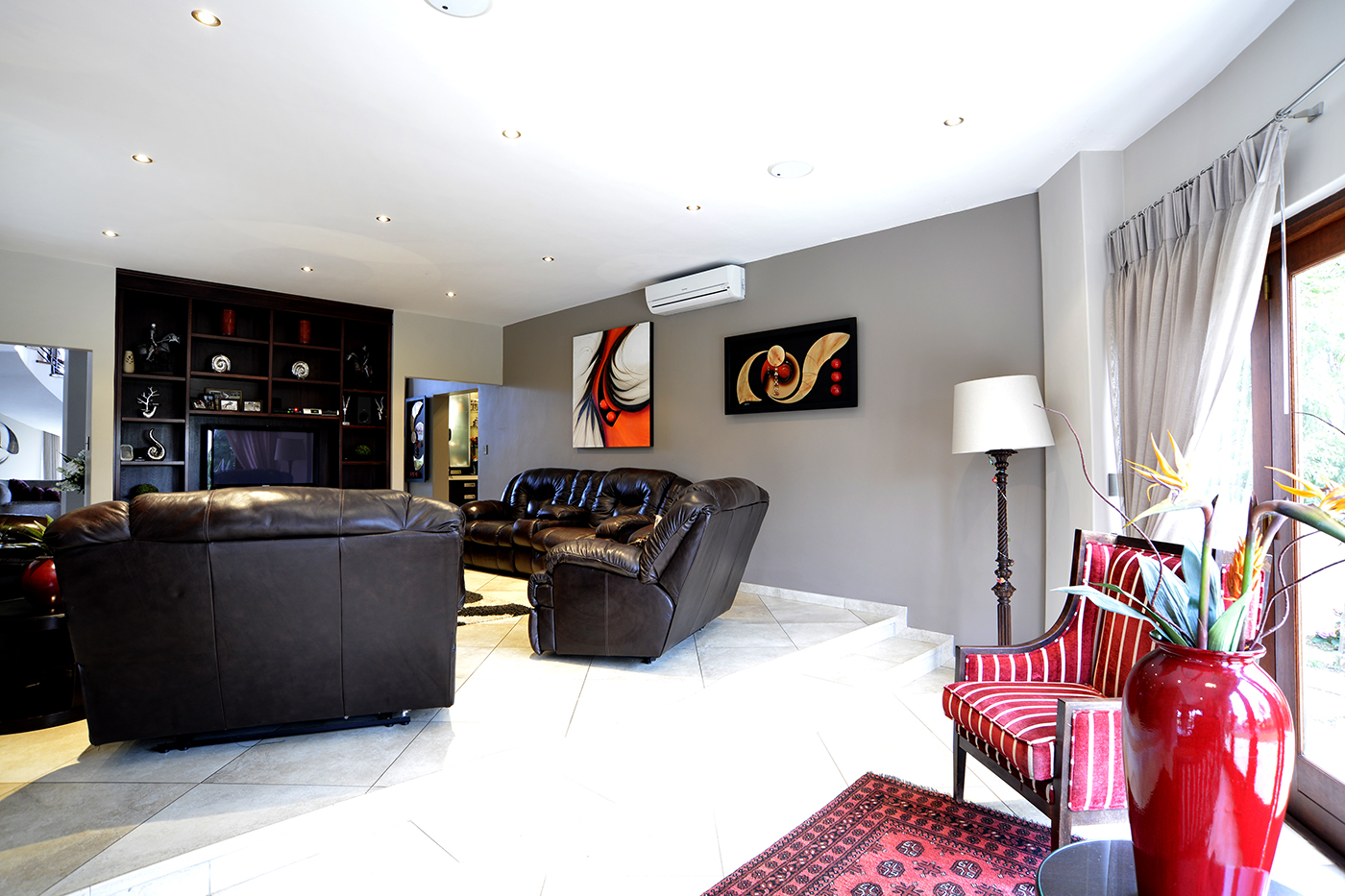 The spacious open-plan living areas are beautifully designed for effortless flow, creating a seamless connection between the reception rooms, entertainment spaces and garden – A focus point is the striking water feature in the centre of the living areas changing colour as you wish. The modern kitchen is fitted with premium appliances, including a steamer, warming drawer and coffee machine, making it as functional as it is stylish. A separate entertainment room offers everything you want to make entertaining an ultimate experience: bar, braai, pizza-oven, area to watch TV, bathroom – leading out onto the boma.