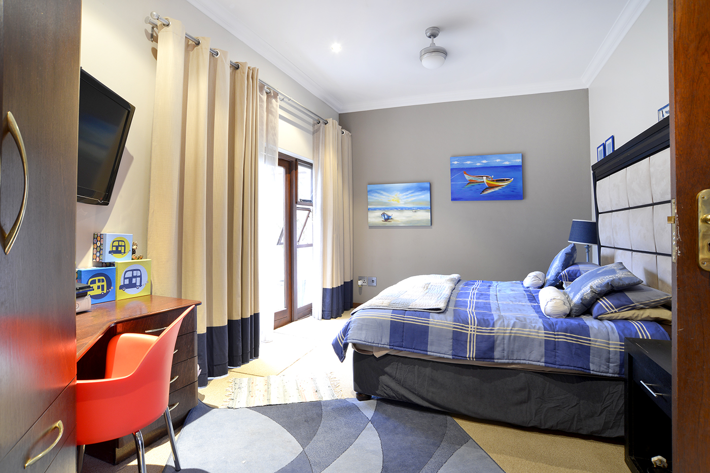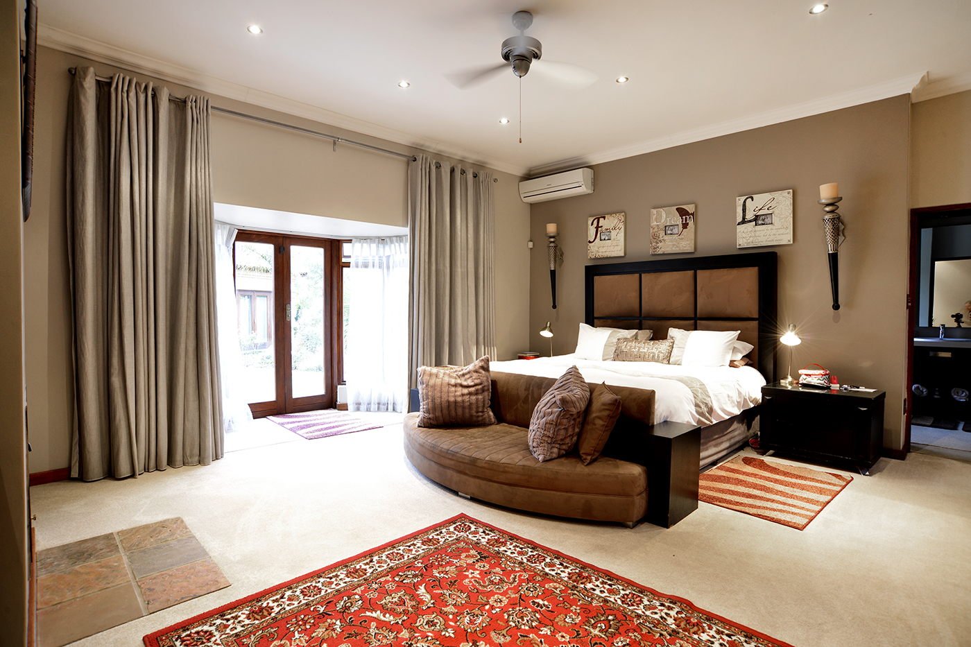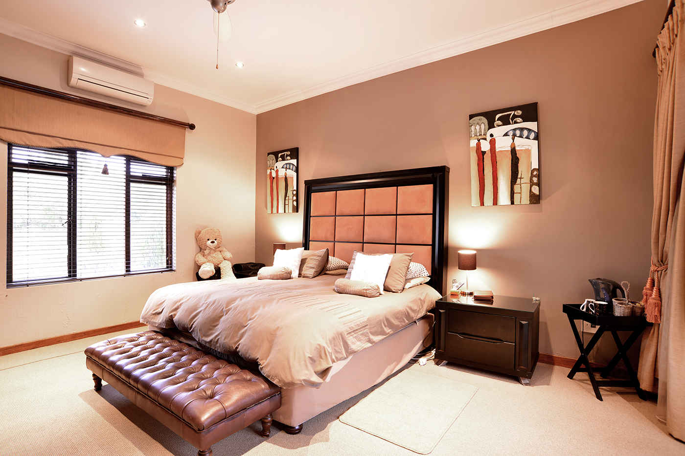The spacious open-plan living areas are beautifully designed for effortless flow, creating a seamless connection between the reception rooms, entertainment spaces and garden – A focus point is the striking water feature in the centre of the living areas changing colour as you wish. The modern kitchen is fitted with premium appliances, including a steamer, warming drawer and coffee machine, making it as functional as it is stylish. A separate entertainment room offers everything you want to make entertaining an ultimate experience: bar, braai, pizza-oven, area to watch TV, bathroom – leading out onto the boma.